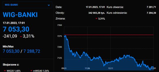Jeśli szukać "winnych" dzisiejszej przeceny na GPW to trzeba skierować się w stronę sektora bankowego. Indeks WIG - Banki stracił 3,3 proc. Ponad 4 proc. przecenione zostały akcje mBanku. Blisko 4 proc. spadł PKO BP. Ponad 3 proc. przeceniono papiery Pekao.