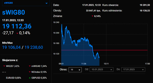 Kolor czerwony dominuje dzisiaj na GPW. WIG20 oraz mWIG40 tracą ponad 1 proc. Dużo lepiej prezentuje się sWIG80, który jest tylko na symbolicznym minusie, a przy odrobinie szczęścia ma szansę powalczyć o tym by wyjść na plus.