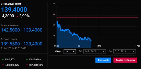 W gronie największych spółek naszego parkietu słabością razi dzisiaj KGHM. Akcje firmy tracą na wartości około 3 proc. co też jest pochodną spadku cen miedzi.