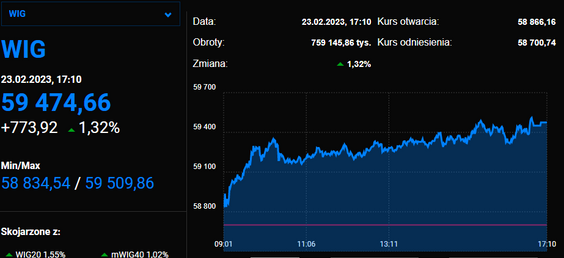 Indeks szerokiego rynku zakończył sesję 1,3-proc. wzrostem. Najmocniej przyczynił się do tego WIG20 zyskujący ostatecznie 1,6 proc. Kupujący mniej aktywni byli wśród spółek drugiej i trzeciej linii. Indeksy mWIG40 i sWIG80 zyskały odpowiednio 1 proc. i 0,6 proc. Wartość obrotów spadła względem tej z środy o 200 mln zł do około 760 mln zł.