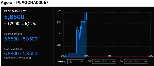 Sąd Apelacyjny w Warszawie utrzymał w mocy wyrok sądu pierwszej instancji, wyrażający bezwarunkową zgodę na przejęcie przez Agorę kontroli nad Eurozet. Wyrok jest prawomocny. W ślad za tym spółka sfinalizowała swoją największą w historii inwestycję w media - na mocy podpisanej tego samego dnia umowy stała się właścicielem kontrolnego pakietu udziałów Eurozet. Rynek pozytywnie przyjął te wieści – kurs Agory rośnie o ponad 5 proc.