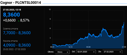 W trakcie poniedziałkowej sesji akcje Cognora kontynuują rajd. Po zwyżce o ponad 9 proc. ustanowiły nowe kilkunastoletnie maksimum, osiągając najwyższą cenę od 2007 roku. Poniedziałkowej zwyżce towarzyszą wysokie obroty, trudno jednak ich wyjaśnieniem szukać w najnowszych komunikatach spółki. Warto jednak przypomnieć , że spółka niedawno zapowiedziała wypłatę sowitej dywidendy (220 mln zł) w wysokości 1,23 zł na akcję.