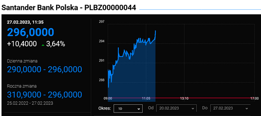 WIG20 utrzymuje niewielką przewagę zyskując ok. 0,4 proc. Duża w tym zasługa drożejących o ponad 3,6 proc. walorów Santandera, które pozytywnie wyróżniają się na tle pozostałych banków (dla porównania akcje Pekao i PKO BP są na minusie). Wyjaśnieniem tego zjawiska może być trwający od ubiegłego piątku skup akcji, który najwyraźniej stanowi istotne wsparcie dla notowań.