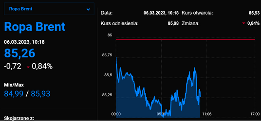Notowania ropy naftowej rozpoczęły nowy tydzień od spadków, ponieważ obawy inwestorów, że Fed będzie dalej mocno zacieśniać politykę monetarną, wzięły górę nad wiarą w odbicie globalnego popytu na paliwa. Baryłka ropy WTI notowanej na giełdzie NYMEX w Nowym Jorku zniżkuje o prawie 0,6 proc. i kosztuje nieco ponad 79 USD. Z kolei cena ropy Brent notowanej w Londynie po zniżce o 0,7 proc. wynosi ok. 85 USD.