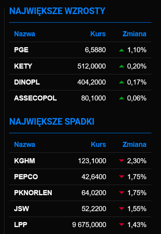 W czwartek inwestorzy w Warszawie najchętniej pozbywają się akcji dużych spółek. WIG20 jest ponad 1 proc. na minusie. Duży w tym udział mają mocno przecenione walory KGHM i PKN Orlen. W czołówce najmocniej przecenionych walorów są także papiery Pepco i JSW. Po kreska w komplecie są także notowane akcje banków, choć skala przeceny w ich przypadki nie jest znacząca. Jednocześnie spadkom skutecznie opierają się notowania Dino i Grupy Kęty i PGE.