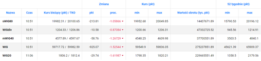 Presja niedźwiedzi się wzmaga. WIG20 spadł o 1,98 proc. na zamknięciu w piątek. WIG spadł o 1,77 proc., mWIG40 zniżkował o 1,37 proc., WIG80 był na 1,36 proc. minusie.