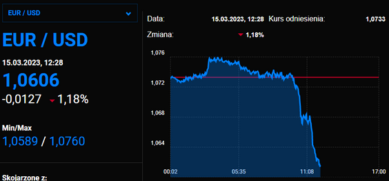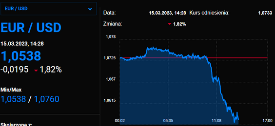 Środowa sesja dostarcza coraz więcej emocji. Za chwilę startuje handel w USA, tymczasem dolar zyskuje względem euro niemal 2 proc. i zmierza poniżej poziomu 1,05. To wszystko odbija się także na rodzimej walucie. Za dolara trzeba zapłacić już ponad 4,46 zł. Tymczasem obawy o recesję i niski popyt na ropę powodują, że cena baryłki ropy WTI spadła poniżej poziomu 70 dolarów.