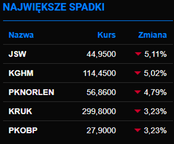 Spadki cen miedzi czy ropy mocno ciążą firmom wydobywczym z warszawskiego indeksu najbardziej płynnych spółek. Sytuacji nie poprawiają zniżkujące notowania banków.