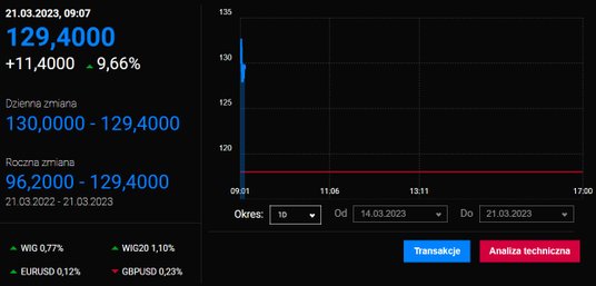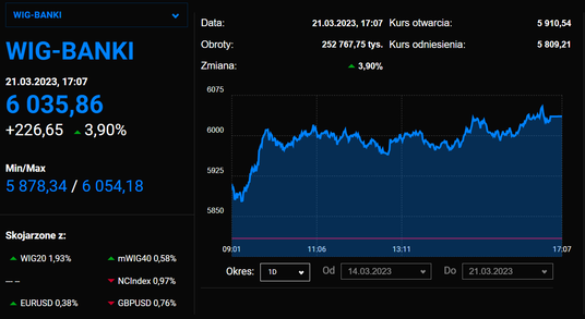 Dow Jones Industrial na zamknięciu zwyżkował 0,98 proc. , S&P 500 na koniec dnia wzrósł o 1,30 proc. a technologiczny Nasdaq Composite wzrósł o 1,58 proc. Banki regionalne zwyżkowały na czele z First Republic, którego walory wzrosły o 30%. SPDR Regional Banking ETF (KRE) zyskał około 6%. Sekretarz skarbu Janet Yellen powiedziała we wtorek rano, że rząd jest gotowy udzielić dalszych gwarancji depozytów, jeśli kryzys bankowy się pogłębi.