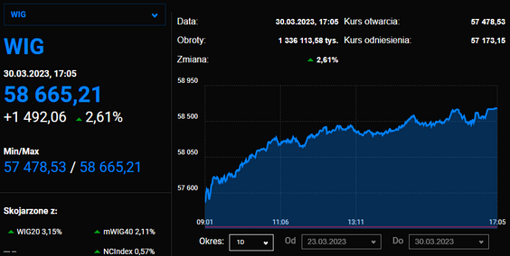Indeks szerokiego rynku wzrósł w czwartek o 2,6 proc. Najmocniej przyczynił się do tego WIG20, który zyskał 3,2 proc. Mocne wzrosty były widoczne w przypadku średnich firm, a mWIG40 zyskał 2,1 proc. Słabiej sytuacja prezentowała się wśród maluchów, a sWIG80 wzrósł zaledwie o 0,1 proc. Wartość obrotów przekroczyła 1,3 mld zł.