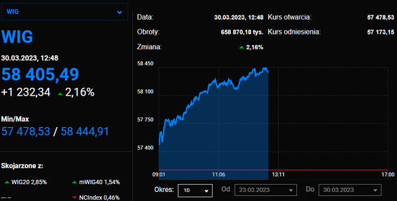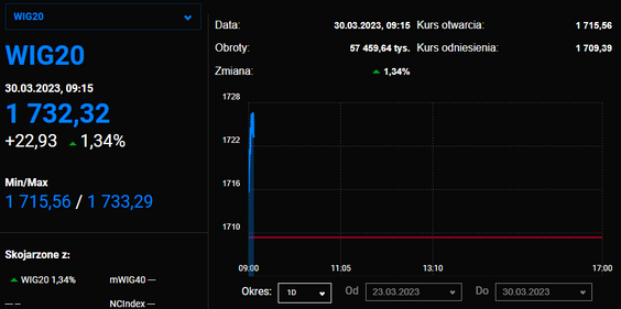 W pierwszych minutach sesji byki przeszły do ataku, a WIG20 zyskuje ponad 1,3 proc. Impulsem mógł być zaskakująco dobry szacunek inflacji CPI w Hiszpanii, która spadła w marcu do 3,3 proc. względem 6 proc. w lutym. Eksperci spodziewali się odczytu na poziomie 3,8 proc.