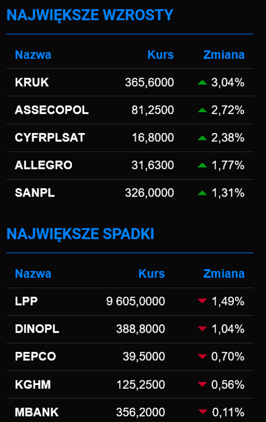 Krajowe indeksy wciąż utrzymują wypracowaną w porannych godzinach handlu niewielką przewagę. Na półmetku sesji WIG20 jest 0,4 proc. na plusie. Zwyżkom w indeksie przewodzą walory Kruka i Asseco, zyskując po prawie 3 proc. Na celowniku kupujących są także papiery Cyfrowego Polsatu i Allegro. Nieco w tyle zostały banki, ale w komplecie utrzymują się na plusach kontynuując wzrostowa serię z poprzedniego, bardzo udanego tygodnia. Natomiast z łask wypadły akcje Dino, CD projektu, LPP i Pepco, co oznacza ich przecenę.