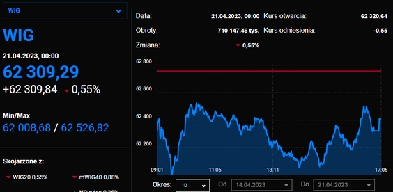 Indeks szerokiego rynku zakończył sesję spadkiem o 0,6 proc. Najmocniej stracił mWIG40, który osunął się o 0,9 proc. Nieco lepiej sytuacja wyglądała w przypadku dużych i małych firm. Indeksy WIG20 i sWIG80 spadły odpowiednio o 0,6 proc. i 0,2 proc. Wartość obrotów nieco wzrosła w ostatnich godzinach sesji, ale ostatecznie spadła względem czwartkowej o około 100 mln zł do 900 mln zł.