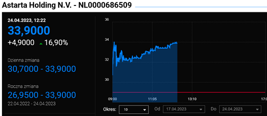 Akcje Astarty drożeją w poniedziałek o ponad 17 proc., notując najbardziej okazałą zwyżkę na szerokim rynku GPW. W efekcie cena akcji ukraińskiego producenta żywności powróciła do poziomu sprzed wybuchu . To odpowiedź rynku na piątkowe dane (opublikowane już po sesji) o sprzedaży wytwarzanych przez spółkę produktów rolnych za I kwartał, które zanotowała dwu- a nawet trzycyfrowe wzrosty rok do roku.