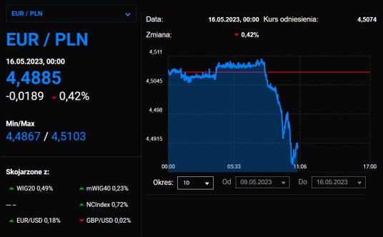 Dane dotyczące PKB w Polsce ewidentnie dodały skrzydeł naszej walucie. Para EUR/PLN spada o ponad 0,3 proc. i przełamuje poziom 4,50. USD/PLN zniżkuje 0,5 proc. i schodzi do poziomu 4,12.