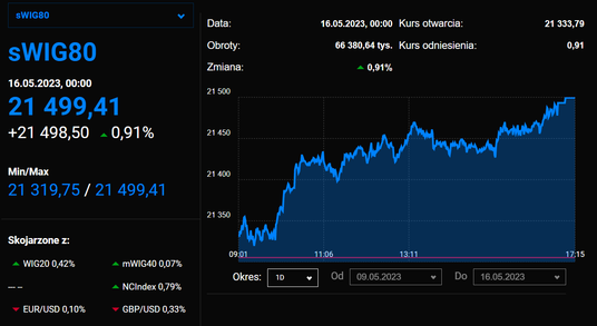 Kolejna wzrostowa sesja w wykonaniu indeksu małych spółek. sWIG80 urósł we wtorek 0,9 proc. i zakończył notowania na poziomie 21 499 pkt. Do historycznego szczytu (21 888 pkt) brakuje mu już niecałe 2 proc.