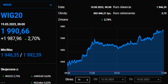 Kwietniowa inflacja CPI w Japonii wzrosła z 3,2 proc. do 3,5 proc. Z kolei niemiecka inflacja PPI osunęła się z 6,7 proc. do 4,1 proc. Eksperci spodziewali się odczytu na poziomie 4 proc. Rynek zapewne wyczekiwać będzie godziny 17, kiedy to wypowiadać się będzie Jerome Powell, prezes Fedu. Inwestorzy szukać będą wskazówek co do tego, czy podwyżki stóp procentowych się zakończyły i kiedy mogą nadejść pierwsze obniżki.