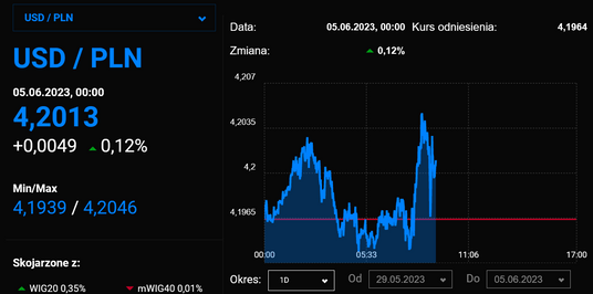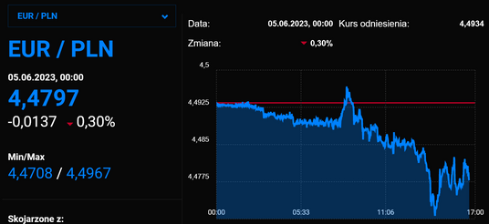 W poniedziałek złoty kontynuował swój rajd z końcówki zeszłego tygodnia. W efekcie kurs euro spadł na moment do poziomu 4,47 zł, co jest poziomem nienotowanym od czerwca 2021 r. Dzień kończy jednak nieco wyżej , bo w okolicach 4,48 zł. Z kolei frank szwajcarski koszutuje nieco ponad 4,61 zł, a dolar ok. 4,18 zł.