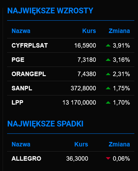 W Warszawie uwaga kupujących skupia się dziś przede wszystkim na największych spółkach. Niemal cały portfel WIG20 jest notowany na plusie. Jedynym wyjątkiem są walory Allegro, które lekko zniżkują. Zwyżkom w indeksie przewodzą akcje Cyfrowego Polsatu, będąc prawie 4 proc. nad kreską. Na celowniku znajdują się także papiery PGE, Orange i CD Projektu. Z kolei nieco w tyle zostały banki, choć wszystkie są notowane na plusach.