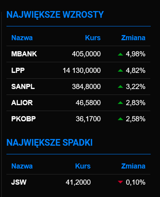 Po lekkim zawahaniu na samym początku sesji inwestorzy handlujący na warszawskiej giełdzie znów nabrali ochoty do kupowania akcji. WIG20 finiszował 1,65 proc. nad kreską, a WIG zyskał prawie1,4 proc. Warto docenić, że handlujący w Warszawie pozostali odporni na negatywne impulsy płynące z pozostałych europejskich rynków, na których wyraźnie brakowało chętnych do zakupów, a indeksy znajdowały się pod presją.