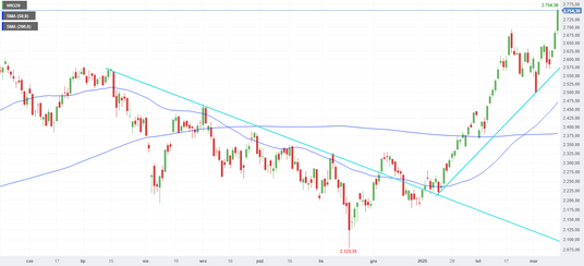 - Inwestorzy coraz częściej widzą wzrosty do 2750, choć dynamika sygnalizuje, że w optymistycznym wariancie możliwy jest zasięg zbliżony do 3000 pkt – ocenia Sobiesław Kozłowski z Noble Securities. - Co do czynników fundamentalnych, to wtorkowe głosowanie w Bundestagu w kwestii zmiany kotwicy budżetowej i ukonstytuowanie funduszu na 500 mld euro sprzyja wzrostom – zauważa Kozłowski. Jego zdaniem do tego wzrosty mogą trwać do potencjalnego rozejmu w wojnie na Ukrainie. - Wyzwaniem jest rozbieżność stóp zwrotu pomiędzy WIG20 oraz DAX w porównaniu z S&P500 i Nasdaq, co może być argumentem do realizacji zysków. Póki co, banki europejskie, banki polskie, DAX i WIG20 są w hossie – przyznaje ekspert Noble Securities.