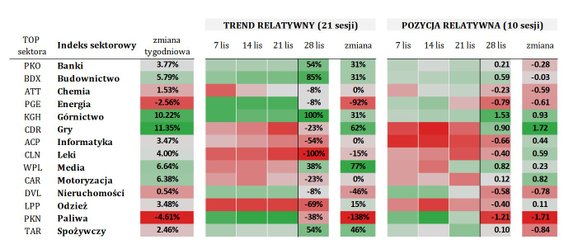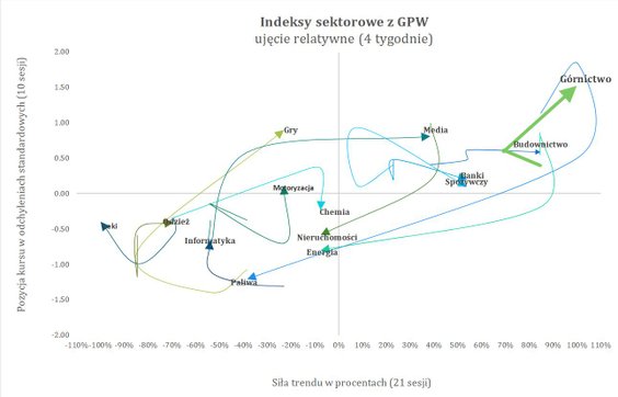 W minionym tygodniu na GPW doszło do znaczących przetasowań w sektorach. Największymi wygranymi okazały się górnictwo i gry, które zanotowały odpowiednio 10,22 proc. i 11,35 proc. wzrostu. Na wykresie sektorowym WIG-Górnictwo wrócił na pozycję wyraźnego lidera, a WIG-Gry przeskoczył z najsłabszej lewej dolnej ćwiartki w lewą górną, co daje dobrą bazę do dalszej poprawy w nadchodzących tygodniach. Warto też zwrócić uwagę na media, które w ostatnich tygodniach przesunęły się dynamicznie w górę i w prawo, co odzwierciedla tygodniowy wzrost siły trendu o 77 p.p. oraz poprawę pozycji relatywnej o 0,82 σ. Poza mediami dobrze radzi sobie budownictwo, które, choć stabilne, utrzymuje stosunkowo silny trend i pozycję relatywną na poziomie +0,59 σ.