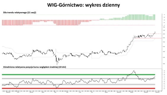 Z drugiej strony doszło do wyraźnego odwrotu w sektorach paliw i energii. W trakcie wzrostowego tygodnia (WIG +2,68 proc.) WIG-Paliwa stracił 4,61 proc., co skutkuje spadkiem siły trendu relatywnego ze 100 proc. do −38 proc. Dodatkowo w ciągu dwóch tygodni pozycja relatywna spadła o ponad 3 σ, co pokazuje, jak silna była realizacja zysków i rotacja sektorowa. Zmiany w indeksie WIG-Energia nie były tak dramatyczne jak w paliwach, ale słabość pozostaje wyraźna, bo dwa tygodnie wystarczyły, aby z ćwiartki „liderów” spaść do ćwiartki „maruderów”.