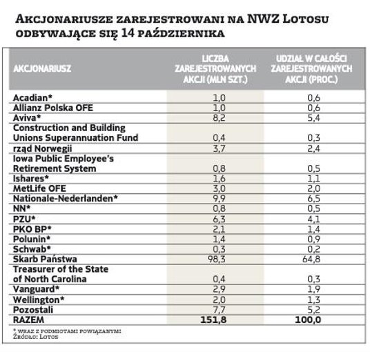 O tym, czy uda się przeforsować uchwałę o zbyciu zorganizowanej części przedsiębiorstwa Lotosu, a tym samym i kontynuowaniu fuzji, zdecydują zatem pozostali akcjonariusze. Wśród nich kluczowe znaczenie mają krajowe i zagraniczne fundusze emerytalne i inwestycyjne. Spośród firm mających siedziby nad Wisłą najwięcej walorów zarejestrowały kolejno: Nationale-Nederlanden, Aviva, MetLife i Allianz Polska oraz podmioty z nimi powiązane. Z kolei znaczący zagraniczni gracze, choć z nieco mniejszą siłą oddziaływania na wyniki głosowań, to przede wszystkim ci skupieni wokół: Vanguard, Wellington, Ishares i Polunin. Razem 14 największych udziałowców (poza Skarbem Państwa, PZU, PKO BP i rządem Norwegii) dysponuje 22,2 proc. głosów. Pozostali mniejsi udziałowcy mają ich łącznie 5,2 proc.