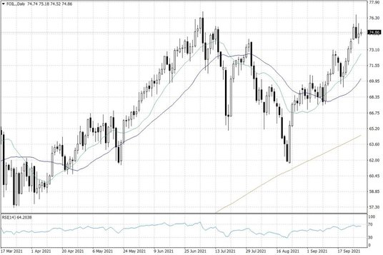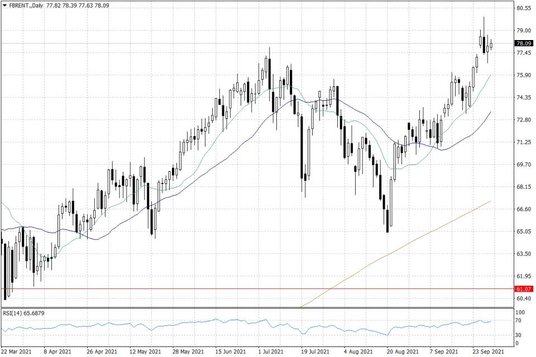 Po dotarciu do wielomiesięcznych maksimów, notowania ropy naftowej wyhamowały zwyżkę. Cena ropy WTI ustabilizowała się w rejonie 75 USD za baryłkę, natomiast notowania ropy Brent, po nieudanym ataku na psychologiczną barierę na poziomie 80 USD za baryłkę, poruszają się w konsolidacji niewiele poniżej tego poziomu, bo w rejonie 78 USD za baryłkę.