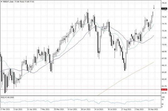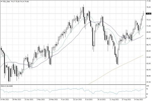 Po ubiegłotygodniowych zwyżkach cen ropy naftowej, nowy tydzień przynosi kontynuację wzrostów cen tego surowca. Cena ropy WTI zbliżyła się już do 75 USD za baryłkę, z kolei notowania ropy Brent wystrzeliły w górę do okolic 78 USD za baryłkę. W obu przypadkach, jest to już piąta sesja wzrostowa z kolei – o ile oczywiście zwyżka utrzyma się do końca dnia.