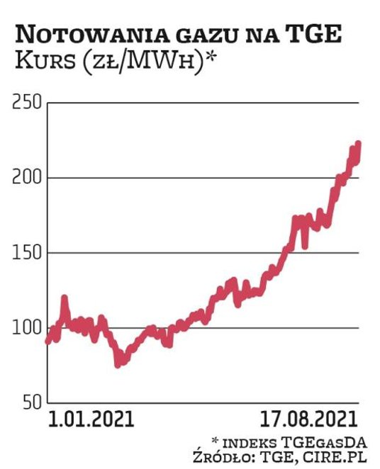 – Bardzo wysoki kurs gazu zimnego w Polsce i Europie to konsekwencja kumulacji kilku czynników. Przede wszystkim duży popyt na ten surowiec zgłasza energetyka, co związane jest z sytuacją panującą na rynku węgla energetycznego i uprawnień do emisji CO2 – mówi Michał Kozak, analityk Trigon DM. Jego zdaniem do tego dochodzą działania podejmowane przez Rosjan, którzy nie zwiększają dostaw błękitnego paliwa do Europy, co widać m.in. po braku rezerwacji na wrzesień dodatkowych mocy przesyłowych w ukraińskich gazociągach tranzytowych. W ten sposób chcą wymóc na swoich europejskich partnerach działania przyczyniające się do szybszego uruchomienia gazociągu Nord Stream 2.