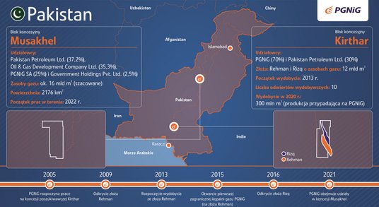 PGNiG pozyskało udziały w koncesji Kirthar w 2005 r. Wydobycie ruszyło z kolei w 2015 r. Dziś eksploatowane są na jej terenie dwa złoża: Rehman i Rizq. W ubiegłym roku PGNiG pozyskało z pakistańskich złóż prawie 300 mln m sześc. gazu, czyli o ponad 50 proc. więcej niż w 2019 r. W kolejnych latach wydobycie planowane jest na poziomie ok. 300 mln m sześc. rocznie. PGNiG chce kontynuować prace poszukiwawcze na koncesji Kirthar. Planuje również wiercenie i zagospodarowanie kolejnych odwiertów eksploatacyjnych na złożach Rehman i Rizq.