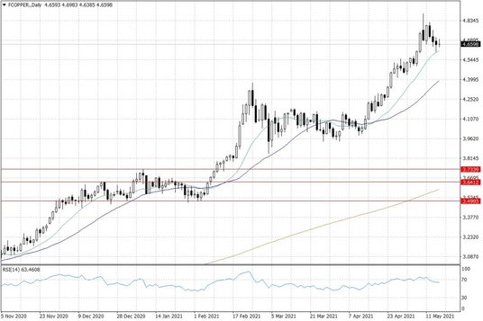 Notowania miedzi w poprzednim tygodniu oddały część wcześniejszych zwyżek, odreagowując wcześniejsze dotarcie do historycznych maksimów. Cena miedzi jednak nie zniżkowała istotnie – notowania tego metalu w USA poruszają się tuż poniżej poziomu 4,70 USD za funt, co oznacza zejście do najniższych poziomów od tygodnia. Dzisiaj sytuacja na wykresie cen miedzi pozostaje stabilna, a notowania tego metalu poruszają się w okolicach piątkowego zamknięcia.