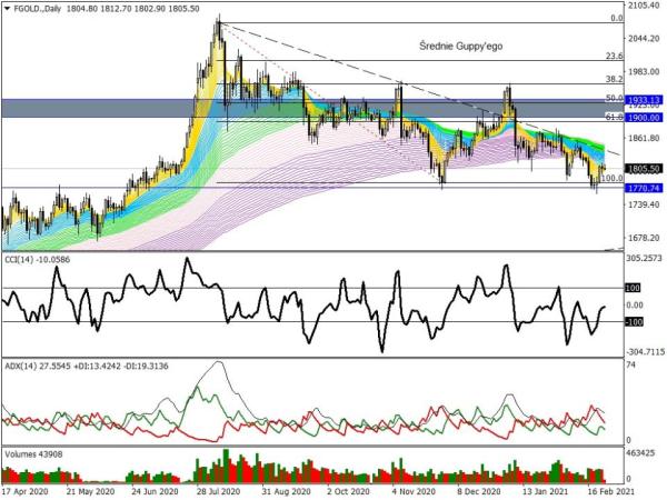 Z powyższej układanki powinno się wyciągnąć jeden zasadniczy wniosek. Otóż komercyjni inwestorzy mocno zredukowali swoje pozycje w długu, po części odnawiając zaangażowanie w złocie i ryzykownych aktywach. Jest to zatem wstępne przygotowanie się graczy pod nową falę odzyskiwania siły przez globalną gospodarkę. Powell zasygnalizował wczoraj, że jeszcze musi sporo czasu upłynąć zanim dojdziemy do celu inflacyjnego, stąd powyżej przedstawiona rotacja kapitałów po części nominuje złoto do układu korekcyjnego, wzrostowego. Taka właśnie mogłaby być odpowiedź inwestorów tego rynku na szykowany plan stymulacyjny J. Bidena oraz przyśpieszenie ożywienia w USA.