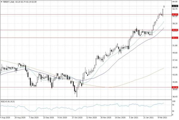 Na rynku ropy naftowej nieustannie widać przewagę strony popytowej. Notowania surowca gatunku WTI w Stanach Zjednoczonych dzisiaj pokonały psychologiczną barierę na poziomie 60 USD za baryłkę po raz pierwszy od stycznia 2020 r. W przypadku europejskiej ropy Brent, ta bariera pękła już tydzień temu, a obecnie mamy do czynienia z notowaniami w okolicach 63,60 USD za baryłkę.