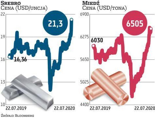 Kurs KGHM dalej zmierza na północ, wspierany odbiciem notowań miedzi, a w ostatnich dniach również mocnymi zwyżkami wycen srebra. Grupa jest drugim co do wielkości globalnym producentem szlachetnego metalu. W środę papiery KGHM drożały nawet o 2,1 proc., do 115,4 zł. Oznacza to, że odbicie od dołka z połowy marca to już 134 proc. Zwyżki miedzi, po trwającej do połowy lipca szarży, zatrzymały się na poziomie 6,4–6,5 tys. USD za tonę. W sukurs przyszło srebro, które w środę atakowało poziom 23 USD za uncję, widziany ostatnio w 2013 r.