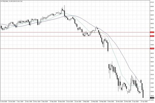 Wczorajsza sesja była ostatnim dniem handlu majowymi kontraktami na ropę naftową WTI, co w dużej mierze tłumaczy tak ogromną zmienność ich notowań. Niemniej, gwałtowność przecen i tak zaskoczyła inwestorów. Panikę wywołały przede wszystkim doniesienia o kończącej się przestrzeni magazynowej w Cushing – czyli w miejscu, do którego dostarczana jest ropa naftowa od posiadaczy amerykańskich kontraktów na ten surowiec.