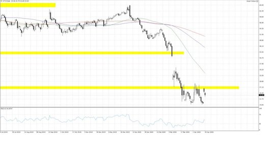 Odmiana Brent rolowana jutro, wyceniana jest powyżej 27 USD za baryłkę. W przypadku majowego kontraktu WTI spadek sięgnął nawet 19% podczas gdy Brent zaledwie 3%. Wszystko to jest wynikiem pojawiających się problemów z magazynowaniem surowca w USA w Cushing, gdzie od końca lutego poziom zapasów wrósł o 48% do 55 milionów baryłek. Z tego względu pojawia się tak duża dysproporcja pomiędzy notowaniami WTI a Brent i tak duża różnica pomiędzy majowym a czerwcowym kontraktem WTI. Ropa tak tania jak obecnie po raz ostatni była w końcówce lat 90-tych. Obostrzenia producentów wejdą w życie dopiero od początku maja i to właśnie teraz ich wydobycie jest rekordowe podczas gdy popyt pozostaje mizerny, ze względu na kulminacyjny moment obostrzeń. Od przyszłego miesiąca mogą one być stopniowo luzowane, z czego cały czas cieszy się rynek akcyjny i co napędza wzrosty głównych indeksów giełdowych. Wydaje się zatem, że rynek jest coraz bliżej punktu zwrotnego na rynku czarnego złota. Choć ropa cały czas znajduje się pod presją, ze względu na obecną sytuację popytowo-podażową, to jednak przyjęte obostrzenia w średnim i długim terminie powinny sprzyjać scenariuszowi odbicia notowań czarnego złota. Za takim scenariuszem przemawia też perspektywa stopniowego otwierania gospodarek.