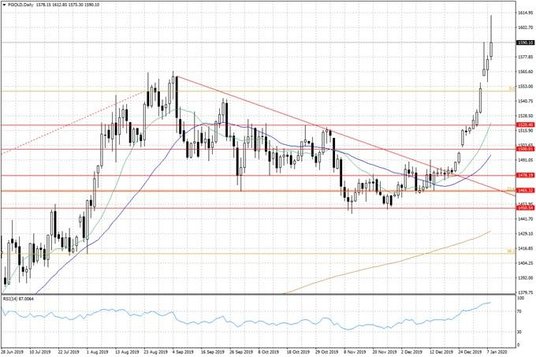 Wzrost napięć na Bliskim Wschodzie sprawia, że inwestorzy na rynkach surowcowych zwrócili swoją uwagę nie tylko na notowania ropy naftowej, lecz także na ceny złota. Dzisiaj notowania żółtego kruszcu zwyżkowały do poziomów przekraczających 1600 USD za uncję, czyli do najwyższego poziomu od prawie siedmiu lat.