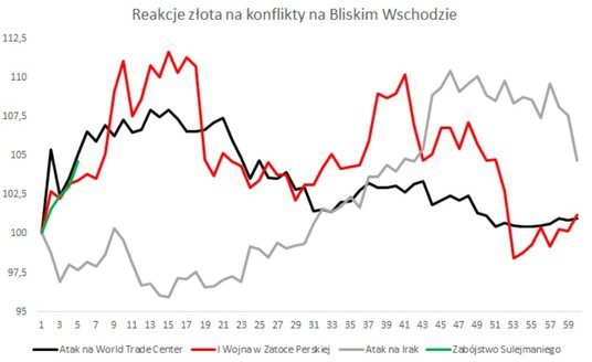 Atak Stanów Zjednoczonych na Kassima Sulejmaniego w Iraku doprowadził do powstania kolejnego silnego konfliktu na Bliskim Wschodzie. Nie tylko zostały zaprzepaszczone szanse na negocjacje nowej umowy nuklearnej, ale Iran zdecydował się również na brak respektowania narzuconych limitów wzbogacania uranu czy braku prac nad bronią. Iran w odpowiedzi na atak Stanów Zjednoczonych zapowiedział „krwawą zemstę". Na faktyczną odpowiedź nie musieliśmy czekać zbyt długo, gdyż już w połowie kolejnego tygodnia Iran zdecydował się na atak rakietowy na amerykańskie bazy w Iraku. Zdaniem Iranu miało dojść do zabicia 80 żołnierzy, natomiast pierwsze doniesienia z USA, choć wciąż niepotwierdzone, wskazują na brak ofiar w ludziach. Tak czy inaczej cena złota zareagowała kolejnymi wzrostami. Od początku całego konfliktu złoto zyskało już ok. 5% i przekroczyło kolejną ważną barierę 1600 USD za uncję. Co dalej?