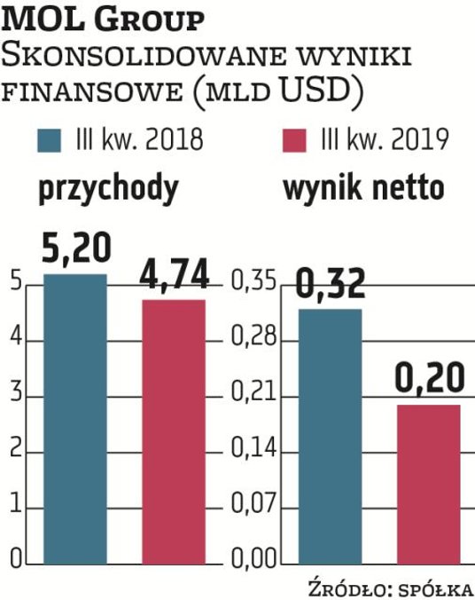 W okresie lipiec–wrzesień szczególnie dotkliwe dla MOL Group były spadki zysków z wydobycia ropy i gazu. Tak jak w przypadku polskich spółek działających na tym rynku, pogorszenie kondycji jest tłumaczone zniżką kursu ropy i mocną przeceną gazu ziemnego. Firma zanotowała też spadek średniej dziennej produkcji węglowodorów do 107,5 tys. boe (baryłki ekwiwalentu ropy). Mimo to wydobycie liczone od początku roku jest na poziomie 112 tys. boe, a więc powyżej celu zakładanego na cały rok.
