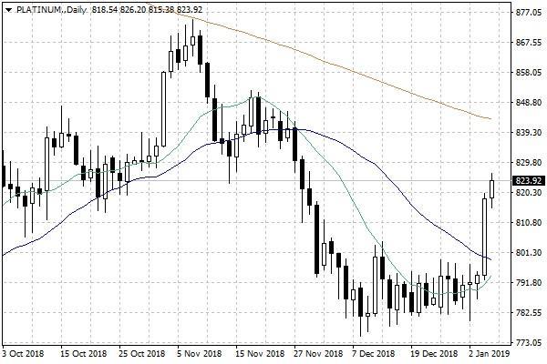 Z kolei kilka ostatnich tygodni poprzedniego roku było na rynku platyny czasem dość wąskiej konsolidacji cen tego kruszcu, w rejonie 780-800 USD za uncję. Dopiero końcówka poprzedniego tygodnia przyniosła dynamiczne wybicie cen w górę, kontynuowane także dzisiaj rano. W rezultacie, cena platyny przekracza już poziom 820 USD za uncję.