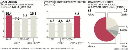Co ciekawe, zysk EBITDA LIFO w latach 2017–2018 obliczono na podstawie już opublikowanych danych, ale i prognozy spółki na IV kwartał tego roku. Przy okazji okazało się, że w tym roku wyniesie on 7,9 mld zł, co jeśli się potwierdzi, będzie oznaczało spadek o blisko jedną czwartą w stosunku do wyniku z 2017 r. W kolejnych latach wzrosty zysków planowane są we wszystkich obszarach działalności koncernu, przy czym największe w segmencie obejmującym produkcję rafineryjną, petrochemiczną i energii.