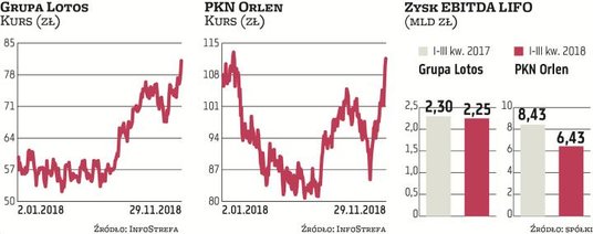 Kurs ropy Brent spadał w czwartek nawet poniżej 58 USD za baryłkę. To bardzo niska cena, zważywszy, że jeszcze na początku października przekraczała 85 USD. Ostatnio za ten surowiec tak mało jak teraz płacono rok temu. Wówczas Orlen i Lotos wypracowywały wyjątkowo wysokie zyski, co było głównie rezultatem wysokich marż rafineryjnych osiąganych na przerobie ropy.