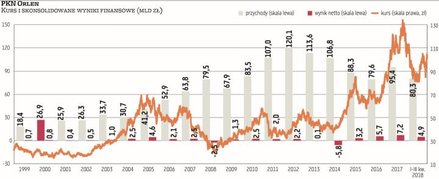 To wszystko powoduje, że PKN Orlen jest największym przedsiębiorstwem nie tylko w Polsce, ale i w Europie Środkowo-Wschodniej. W ubiegłym roku grupa zanotowała 95,4 mld zł przychodów ze sprzedaży i 7,2 mld zł zysku netto. Obie pozycje z rachunku wyników były najwyższe w historii firmy. Ten rok jest nieco słabszy, przede wszystkim za sprawą otoczenia makroekonomicznego, a zwłaszcza niższych marż rafineryjnych i petrochemicznych odnotowywanych w Europie. Z ostatnich danych wynika, że po trzech kwartałach PKN Orlen wypracował 80,3 mld zł przychodów i 4,9 mld zł zysku netto. Rok do roku sprzedaż wzrosła o 13,7 proc., ale zarobek spadł o 11,7 proc.