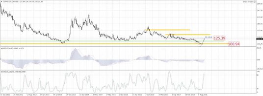 – Październik ma szanse zakończyć się największą białą świecą w ciągu dwóch lat. Można to interpretować jako sygnał zakończenia spadków w długim terminie i początek trendu wzrostowego. Taki ruch przerywany jest korektami i zapewne najbliższe dni lub tygodnie przyniosą próbę powrotu do ostatniego dołka. Historia wskazuje, że w ramach dotychczasowych zwyżek lokalnie użyteczny był jeszcze poziom 120 centów za funt i tu można spodziewać się pierwszej próby zatrzymania spadków – twierdzi Paweł Śliwa, analityk DM mBanku. Jak zauważa, na interwale tygodniowym październikowe zwyżki geometrycznie zrównały się z korektą z lipca 2017 roku. – To ogranicza potencjał zwyżek w najbliższym czasie. Pokonanie oporu 125 centów w przyszłości będzie zapowiedzią kolejnego rajdu do dalszych stref oporowych 140 i 160 centów. Wskaźnik MACD nie jest jeszcze optymistycznie nastawiony. Zbliżył się do wartości zero, ale jeszcze nie zdoła jej pokonać, co potwierdza niedźwiedzie nastawienie po tak silnych zwyżkach. Oscylator stochastyczny potwierdza mocno ograniczone możliwości kupujących ten towar. Przebywanie w strefie wykupienia, kiedy na rynku przeważają spadkowe nastroje, jest zapowiedzią zakończenia korekty i rozpoczęcia impulsu spadkowego – uważa Śliwa.