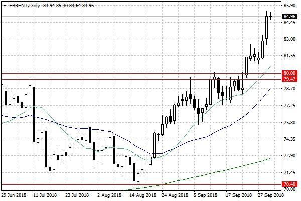 Ostatnie kilka dni na rynku ropy naftowej upłynęły pod znakiem dynamicznych wzrostów cen. Notowania europejskiej ropy Brent już w poprzednim tygodniu wybiły się ponad barierę 80 USD za baryłkę, wczoraj docierając do poziomu 85 USD za baryłkę. To najwyższy poziom cen ropy Brent od 2014 roku. Zwyżkę przyspieszyły także ceny amerykańskiej ropy WTI, która wczoraj przekroczyła poziom 75 USD za baryłkę i dzisiaj dalej delikatnie pnie się w górę, osiągając tym samym najwyższe poziomy w bieżącym roku i również najwyższe notowania od 4 lat.