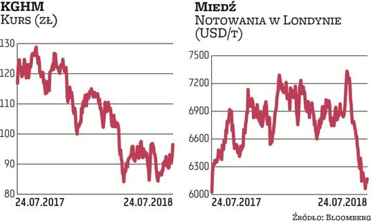 W ciągu niewiele ponad miesiąca kurs KGHM wzrósł o blisko 15 proc., do prawie 97 zł. Notowania koncernu zachowują się w ostatnim czasie lepiej niż miedzi na giełdzie w Londynie: od szczytu z początku czerwca metal potaniał o prawie 16 proc., do prawie 6,2 tys. USD za tonę. Kurs KGHM, dzięki wspomnianemu wzrostowi, wyszedł w tym czasie na zero.