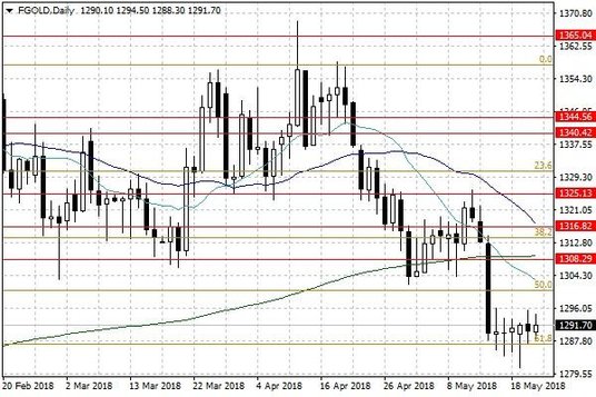 Po gwałtownym spadku notowań złota na początku poprzedniego tygodnia, notowania kruszcu wpadły w konsolidację, trwającą do dzisiaj. W rezultacie, w ciągu ostatnich kilku dni cena złota poruszała się przez większość czasu w okolicach 1283-1293 USD za uncję. Tym samym, cena kruszcu porusza się tuż powyżej technicznego wsparcia, wyznaczonego przez poziom Fibonacciego wyznaczający zniesienie 61,8% ruchu wzrostowego z grudnia 2017 r. i stycznia 2018 r.