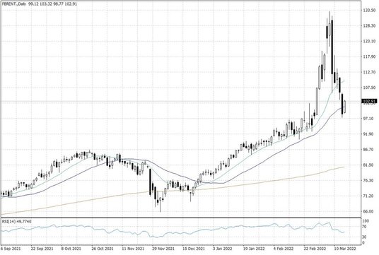 Powyższe obawy doprowadziły do dynamicznej zwyżki notowań ropy naftowej, którą obserwowaliśmy na początku marca. Jednak po poziomach sprzed tygodnia nie ma już śladu – ceny ropy naftowej w ostatnich dniach spadały, niwelując cały wzrostowy ruch z pierwszych dni bieżącego tygodnia. Wszystko za sprawą sygnalizowanych coraz częściej wątpliwości dotyczących popytu na ropę w 2022 roku.